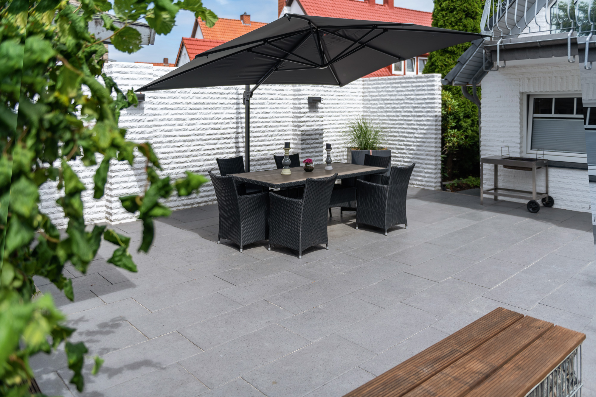 Die leicht strukturierte Oberfläche verleiht den Platten eine hochwertige, natursteinähnliche Anmutung. Dadurch wirken sie besonders edel und werten Terrassen, Gehwege und Gartenbereiche stilvoll auf.