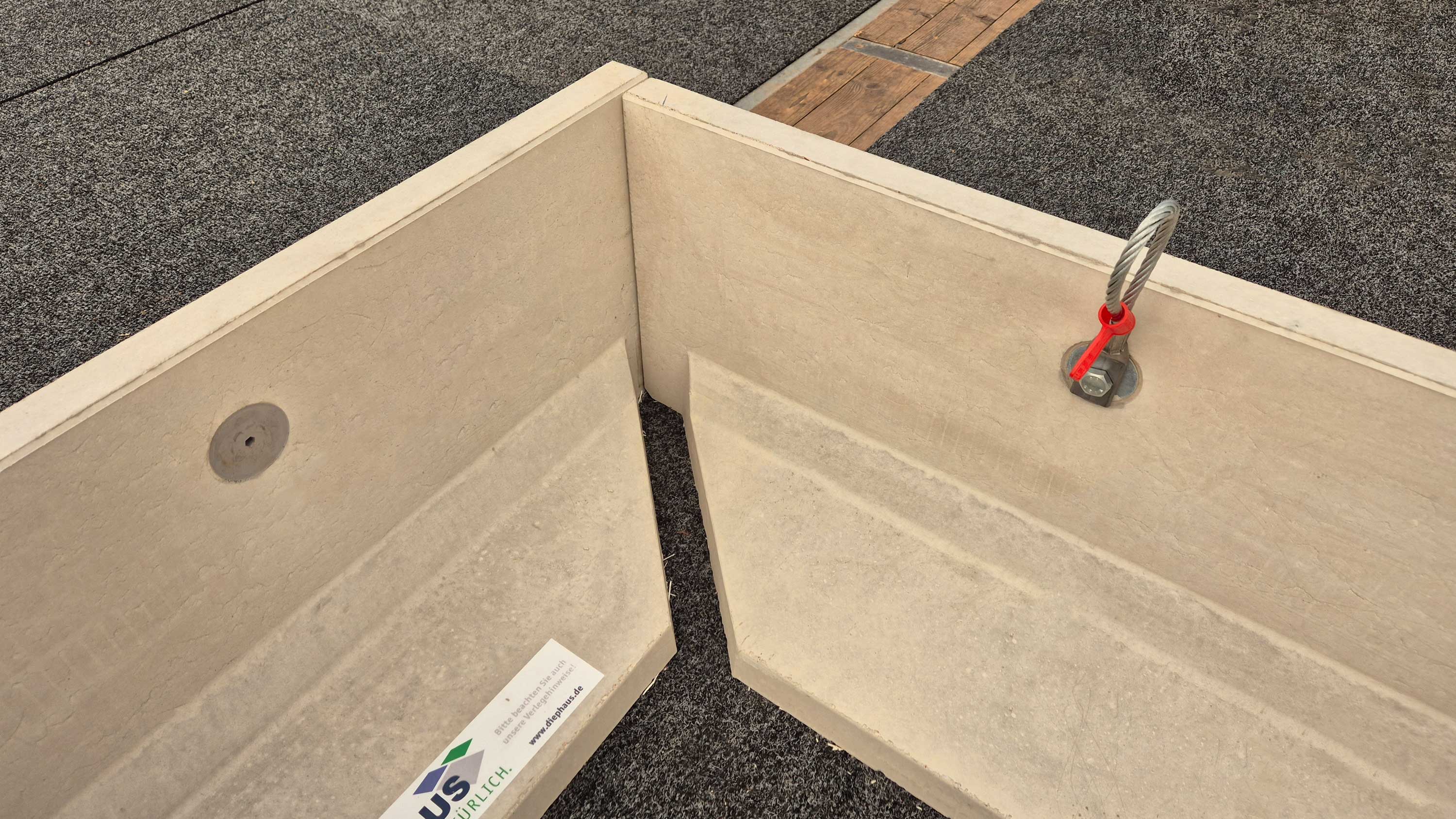 Jeder Stein ist mit einer eingelassenen Hülse ausgestattet, die die Befestigung einer Abhebeschlaufe oder eines Versetzankers ermöglicht.