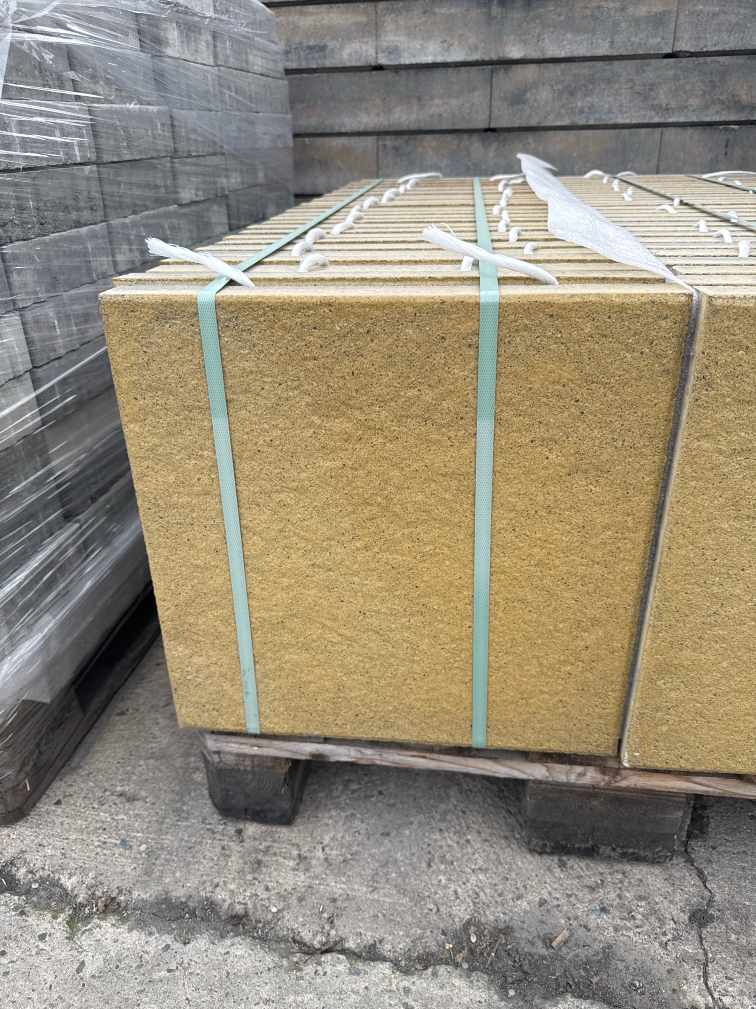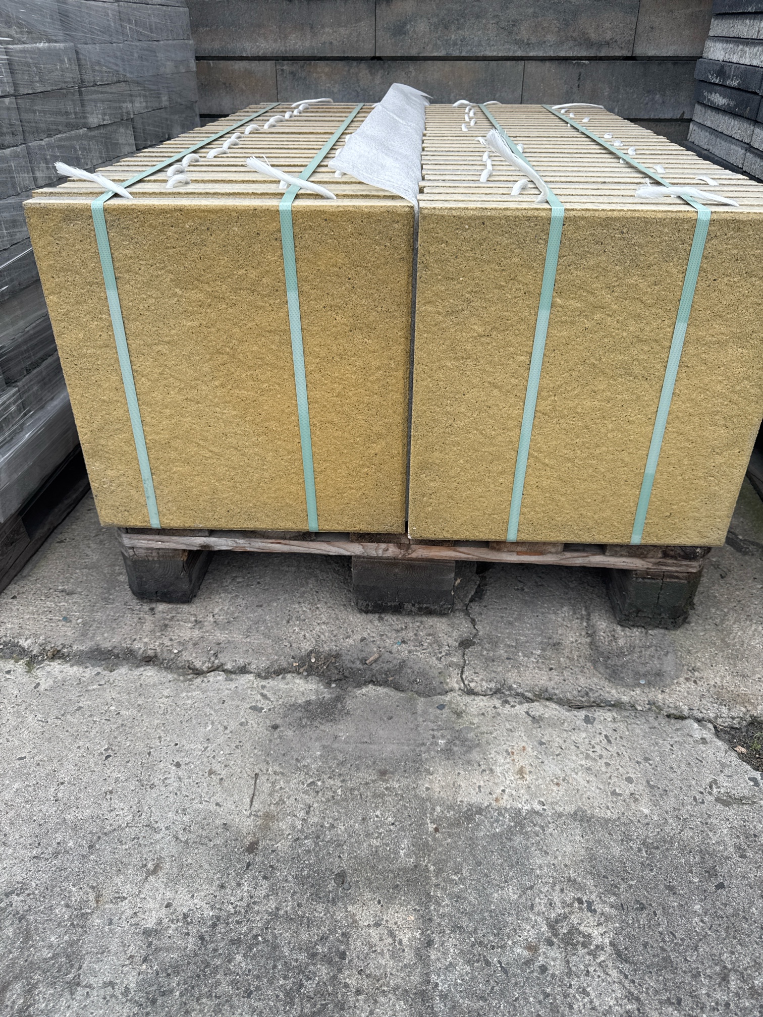 Terrassenplatten die Belgische Sandstein im Format 40x40x4 cm als B-Ware mit Fehlern in der Beschichtung und es sind Kalkflecken möglich
