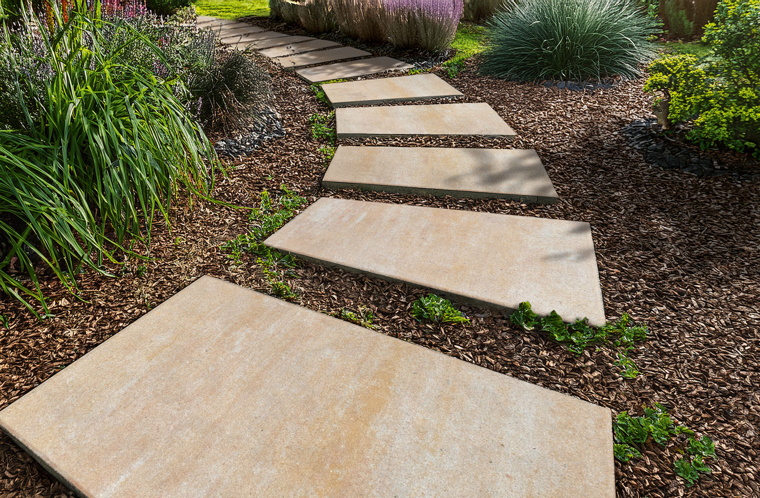 Einzeln verlegt eignen sich die TRAPEA Platten perfekt als Trittplatten. Je nach Ausrichtung entstehen gerade oder geschwungene Wege, die sich harmonisch in jedes Gartenkonzept einfügen. Damit sind die Platten eine ebenso praktische wie stilvolle Lösung für private Gärten und öffentliche Anlagen.