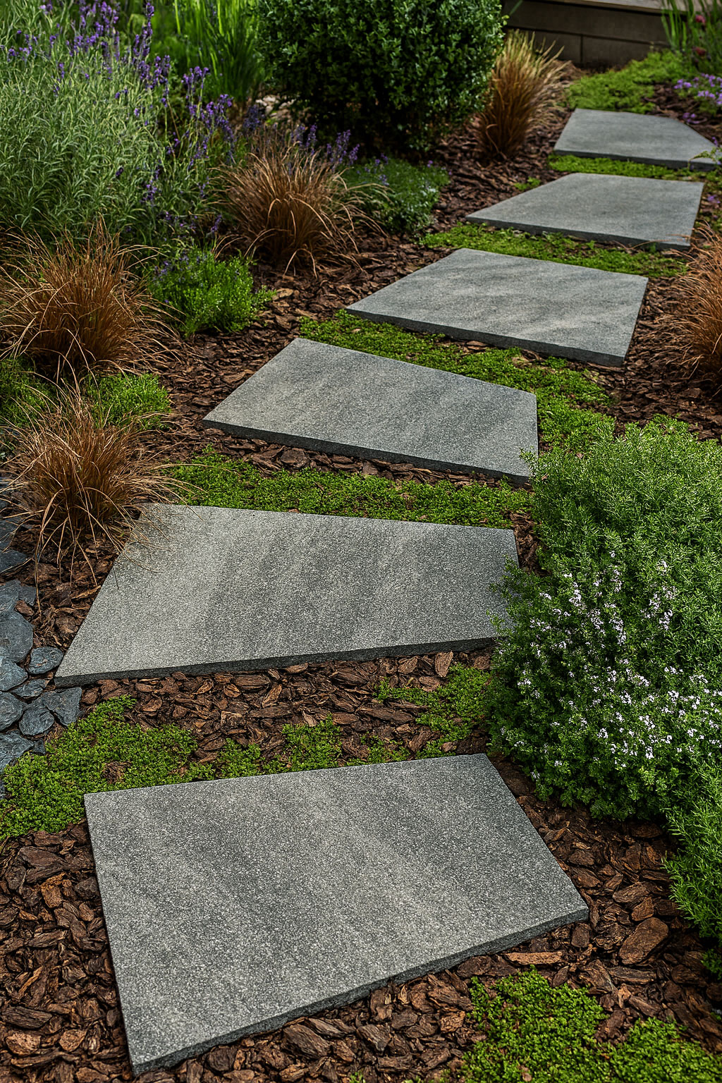Einzeln verlegt eignen sich die TRAPEA Platten perfekt als Trittplatten. Je nach Ausrichtung entstehen gerade oder geschwungene Wege, die sich harmonisch in jedes Gartenkonzept einfügen. Damit sind die Platten eine ebenso praktische wie stilvolle Lösung für private Gärten und öffentliche Anlagen.